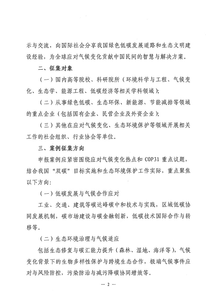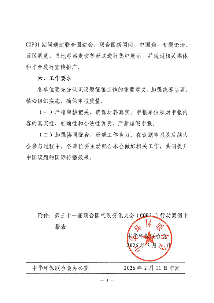 为系统梳理并集中展示我国应对气候变化的创新实践,向国际社会讲好中国绿色发展故事,作为经国务院批准、民政部登记注册、生态环境部为行业管理部门,并具有联合国经济及社会理事会特别咨商地位的全国性非营利社会组织——中华环保联合会,会同其下设“一带一路”生态产业合作工作委员会,正式启动“第三十一届联合国气候变化大会(COP31)行动案例征集”工作,诚邀各有关单位系统总结实践成果,共同将中国民间的智慧与解决方案推向世界舞台。