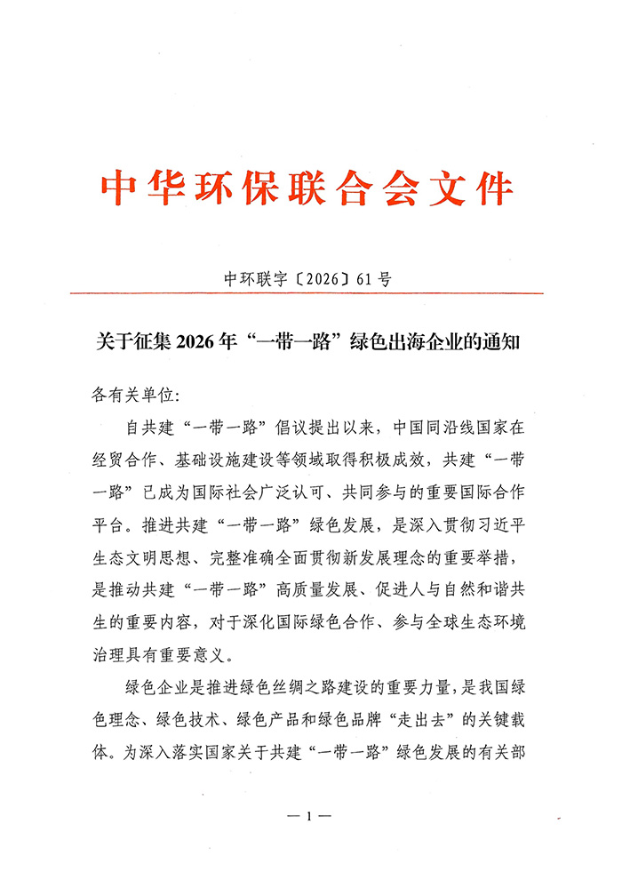 为深入贯彻习近平生态文明思想,全面落实共建“一带一路”绿色发展合作倡议,推动我国绿色技术、绿色产品和绿色服务高质量“走出去”,中华环保联合会现启动2026年度“一带一路”绿色出海企业征集工作。