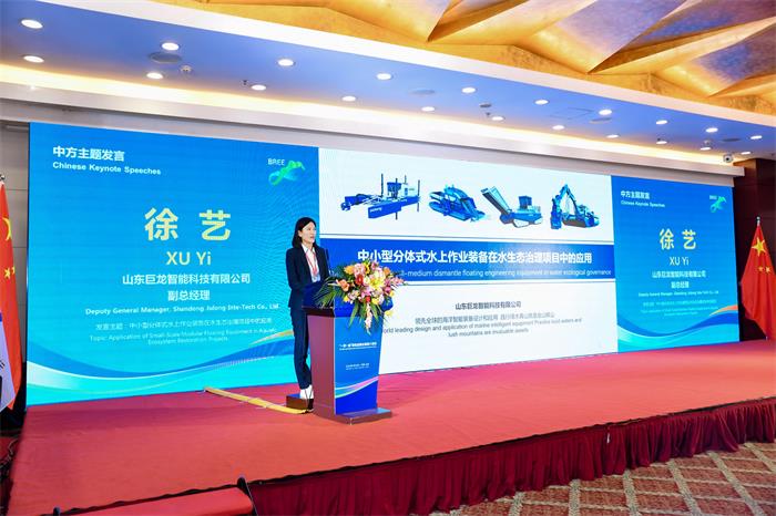 在会上,山东巨龙智能科技有限公司作为重点推介企业代表,以《中小型分体式水上作业装备在水生态治理项目中的应用》为主题发表演讲,介绍了企业在水生态治理、智能疏浚装备及生态修复方面的创新实践。巨龙公司的发言赢得了与会嘉宾的广泛关注,尤其引起了基里巴斯驻华大使戴维·提阿博阁下的浓厚兴趣。