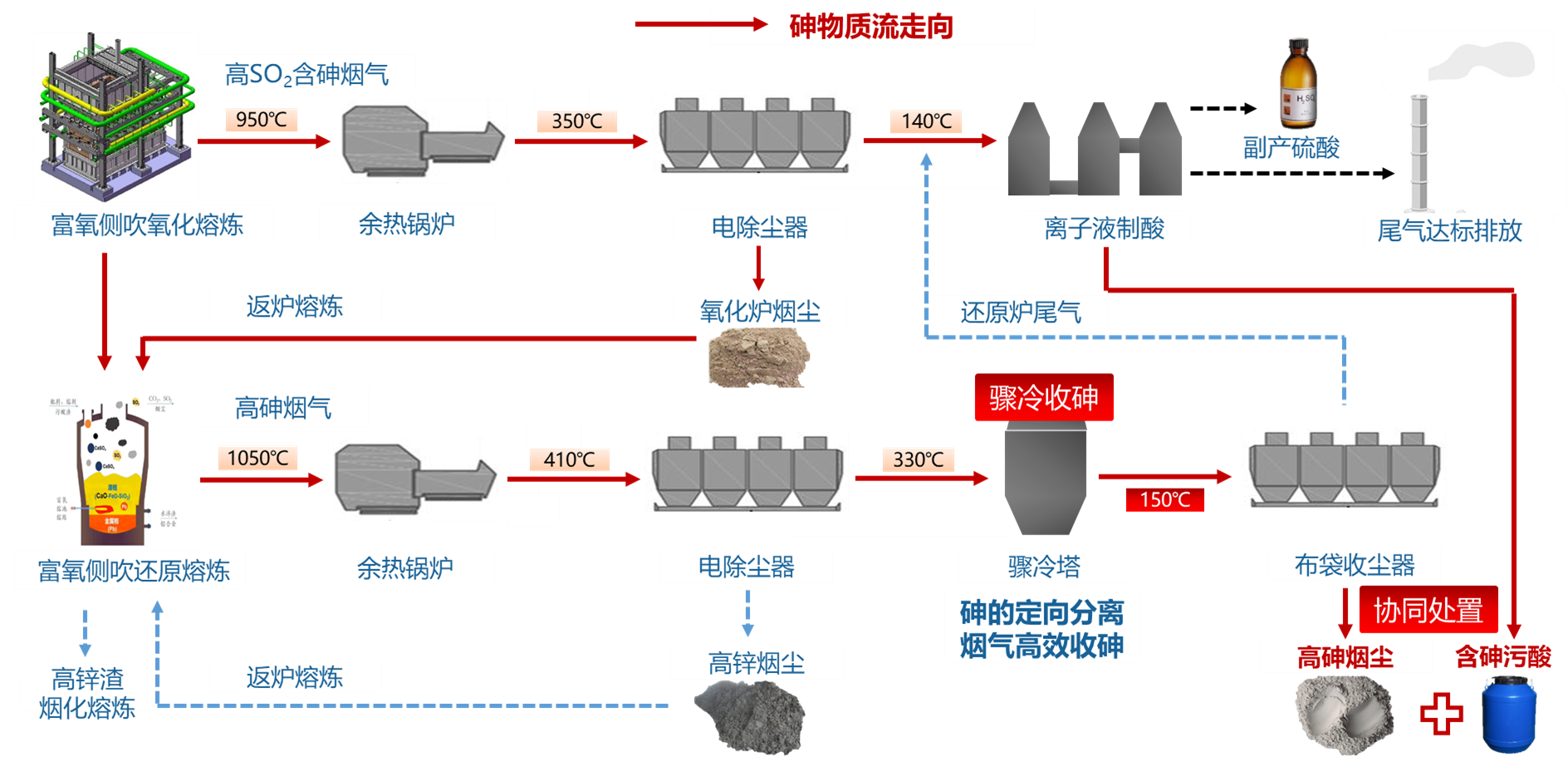 采用重金属危废与黄铁矿协同熔炼技术和富氧侧吹三联炉工艺,回收Pb、Bi、Cu、Sn、Sb、Zn、Au、Ag、In等有价元素,将As定向从还原炉烟气中开路,再利用污酸协同浸出制备高纯氧化砷。主要技术参数