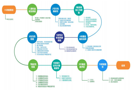 2)关键技术路线:配制装置的搭建、高纯本底物质的纯化、重量-重量法配制、产品均匀性稳定性监测、标准样品申报。技术路线图如下: