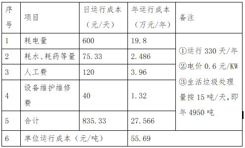 ① 年投资成本折旧:台套设备投资271.98万元,设计使用寿命二十年,按直接折旧法,每年折旧271.98÷20=13.599万元。② 生活垃圾处理项目是公益事业项目,处理原料是生活垃圾,政府应支付生活垃圾处理费。参照生活垃圾发电厂政府购买服务性支出为180元/吨,年生活垃圾处理费(5475×180元)98.55万元,是垃圾处理企业的主要收入。