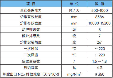 垃圾在垃圾库内经过充分发酵,由抓斗抓起投到料斗里,再通过溜槽滑到给料平台上,给料小车把给料平台上的垃圾连续不断且均匀地推到炉排上,炉排在油缸的驱动下不停地作逆推往复运动,垃圾在炉排上翻转、搅拌、并缓慢往下移动进行干燥、燃烧和燃烬,燃烬后的炉渣随着滚筒转动翻落到出渣机上,再由出渣机推到渣池里。主要技术参数