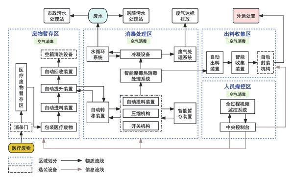 该技术包括信息录入、上料提升、转移传送、翻转进料、评估补料、消毒处理、定量出料、外运处置等环节。医废收集后送至传送装置,扫描并完成称重,信息保存形成电子台账,随后废物自动传送至投料点,舱盖同步打开,废物自动投入消毒舱内部,系统反馈是否补箱进料,进料完毕后舱盖关闭锁死,舱内刀具旋转破碎,进行高温消毒,消毒完成后智能收集装置进行定量收集和打包封装,打包封装后产物进行外运处置。空周转箱自动传送回暂存区。