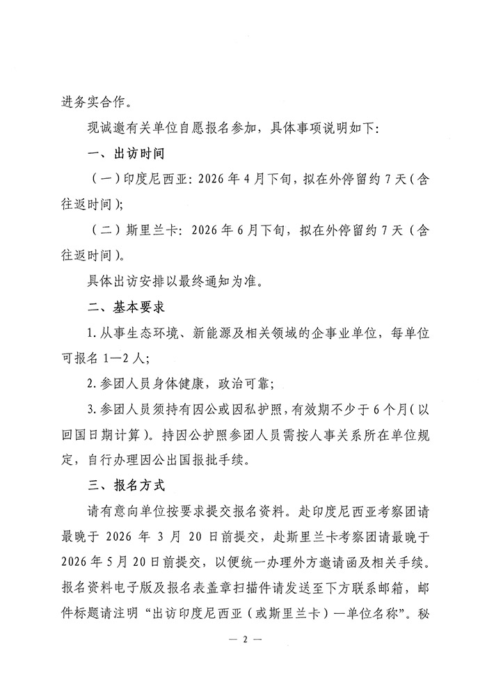 为深入贯彻绿色发展理念,服务“一带一路”倡议深入实施,推动我国环保与新能源企业加速“走出去”进程,深化与沿线国家在生态环境治理、绿色产业培育及可持续发展领域的深度务实合作,经研究,拟于2026年4月中下旬组织赴印度尼西亚考察团、2026年6月下旬组织赴斯里兰卡考察团,开展专题出国考察与项目对接活动。现将有关事项通知如下:
