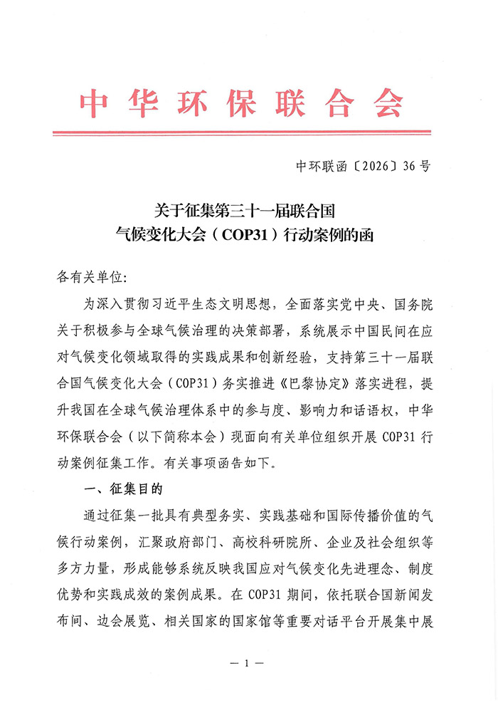为系统梳理并集中展示我国应对气候变化的创新实践,向国际社会讲好中国绿色发展故事,作为经国务院批准、民政部登记注册、生态环境部为行业管理部门,并具有联合国经济及社会理事会特别咨商地位的全国性非营利社会组织——中华环保联合会,会同其下设“一带一路”生态产业合作工作委员会,正式启动“第三十一届联合国气候变化大会(COP31)行动案例征集”工作,诚邀各有关单位系统总结实践成果,共同将中国民间的智慧与解决方案推向世界舞台。