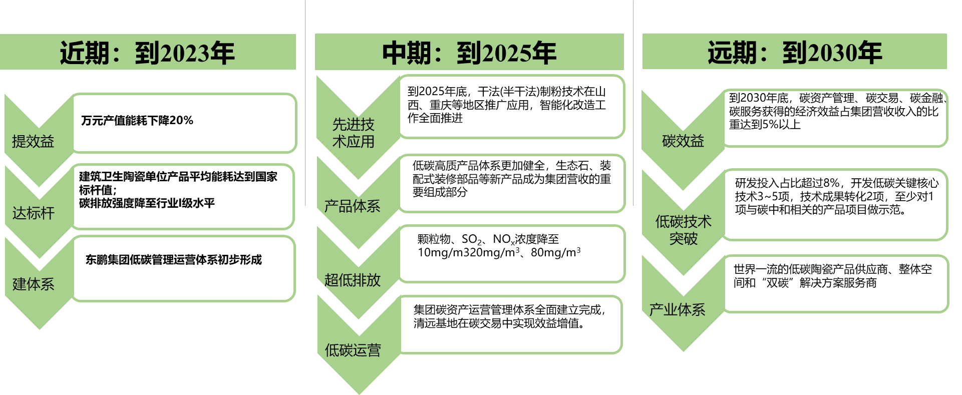 东鹏控股作为陶瓷行业的头部企业,紧跟国家碳达峰碳中和的战略方针和政策导向,将绿色供应链管理纳入企业的发展战略与规划,围绕低碳技术研发、产品设计、生产过程管理、供应链管理、营销管理等方面开展工作,逐步建立企业全生命周期的绿色供应链管理体系,提升产业链、供应链的现代化水平,支撑企业长期的绿色低碳发展目标。企业为提高绿色供应链管理水平,制定了未来三年的目标及重点实施项目,具体目标及项目如下: