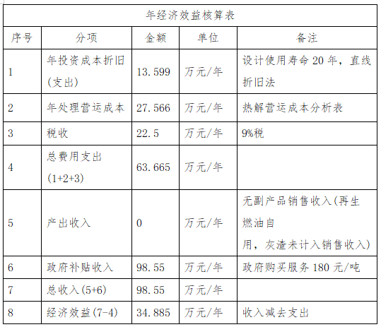 ① 年投资成本折旧:台套设备投资271.98万元,设计使用寿命二十年,按直接折旧法,每年折旧271.98÷20=13.599万元。② 生活垃圾处理项目是公益事业项目,处理原料是生活垃圾,政府应支付生活垃圾处理费。参照生活垃圾发电厂政府购买服务性支出为180元/吨,年生活垃圾处理费(5475×180元)98.55万元,是垃圾处理企业的主要收入。